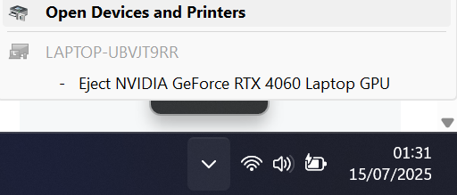 This is actually a weird Windows bug. Somehow, Windows is listing discrete graphics cards inside the “Safely remove hardware and media” menu — the same tool you’re supposed to use when unplugging a flash drive (which, let’s be honest, most people never do). So, seeing an option to eject your expensive, built-in GPU understandably freaked some folks out.